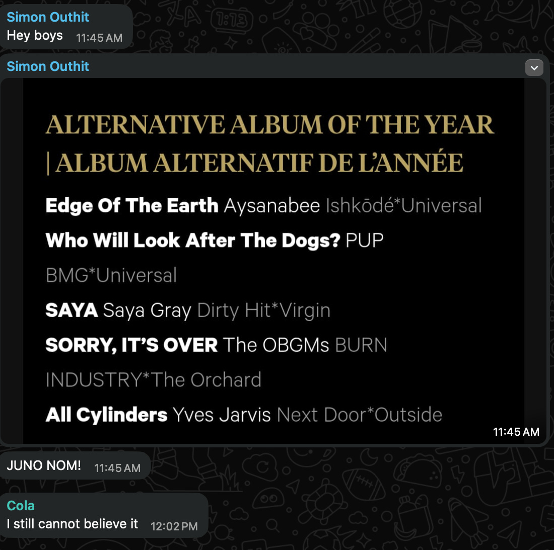 But this experience made me slow down and realize something. What we’re doing is actually pretty unprecedented. A band like ours isn’t supposed to reach this level without the systems that normally support it. I can confidently say no other Black-fronted punk band in Canadian history has been shortlisted for the Polaris Prize twice and has an Alternative Album of the Year nomination.
